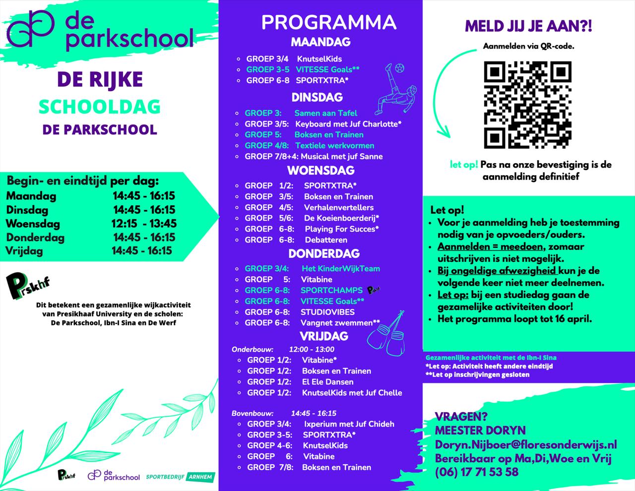 Het programma wisselt na iedere vakantie. Ouders dienen hun kind in te schrijven. Dat kan via Social Schools of de Rijke Schooldag coördinator, zodra het nieuwe programma bekend is.